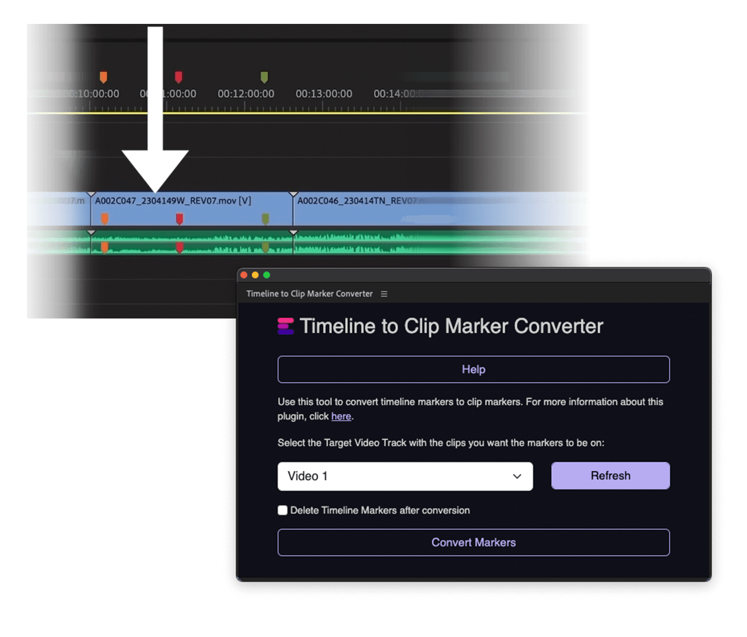 Cu acest plugin puteți converti cu ușurință toate marcajele cronologice în marcaje de clip. De asemenea, puteți selecta stratul video în care să le plasați și să eliminați automat marcajele cronologice după conversie. Utilizați acest plugin pentru a plasa toate marcajele cronologice pe clipuri video.